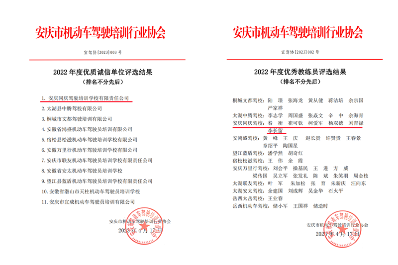 近日,安庆市机动车驾驶培训行业协会开展了2022年度安庆市驾培行业优质诚信单位和优秀教练员评选活动,安庆同庆驾校荣获“2022年度优质诚信单位”称号,同时昝衡、崔可钦、柯爱军、杨双德、刘青禄、李长留6位同志荣获“2022年度优秀教练员”称号。