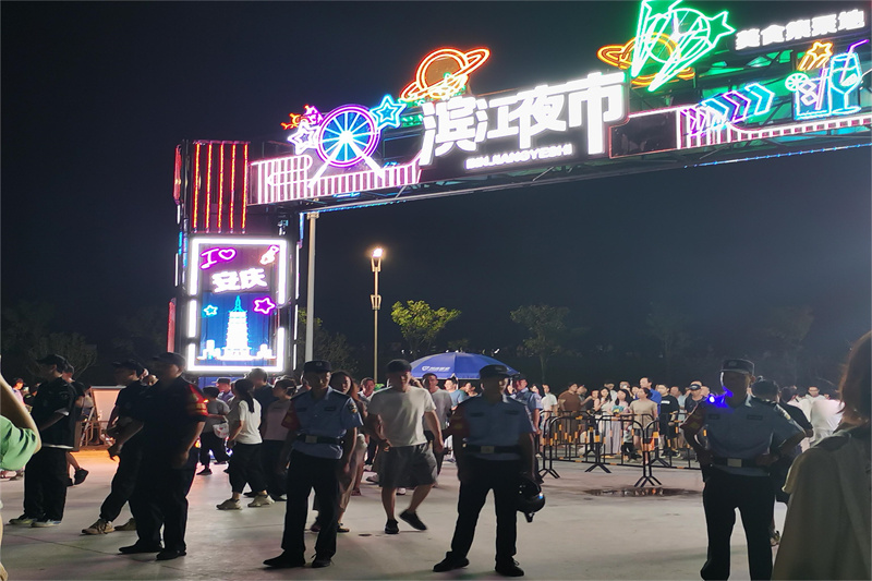 滨江夜市建设前,流动摊贩占用了安广江堤3公里路面,车辆乱停乱放,垃圾随意丢弃等现象随之而来。一边是满满的烟火气,一边是安全、卫生等方面的隐患。在充分听取民意的基础上,安庆市决定在取缔流动摊贩的同时,就近利用闲置地块,设置流动摊贩疏导点,引摊入市。如今,占地近3万平方米的安庆滨江夜市疏导点终于建成营业。在这热闹的背后,对治安、消防等方面的要求也更高。为了确保安全,安庆创新开展警保联勤模式,联合同庆保安公司开展夜巡工作。