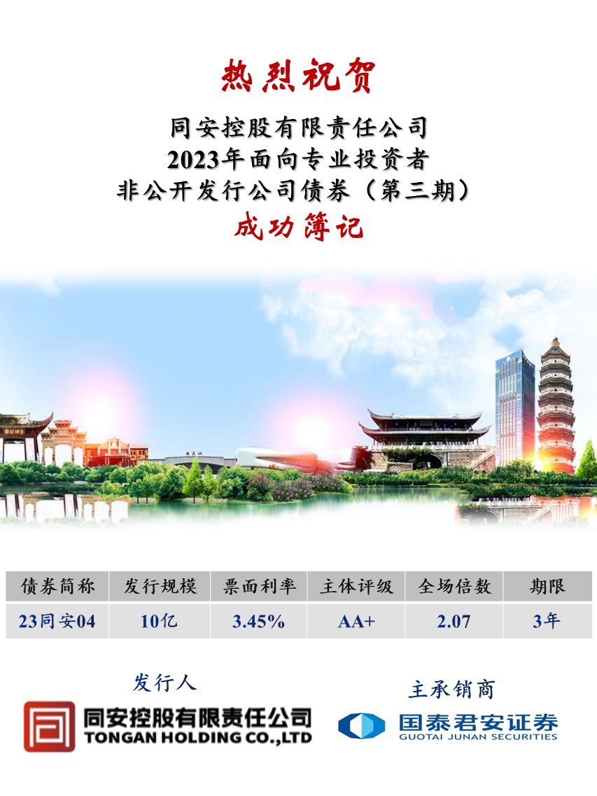 9月26日,同安控股有限责任公司2023年面向专业投资者非公开发行公司债券(第三期)成功簿记,这是同安控股今年发行的第四期公司债券,募集资金10亿元,票面利率3.45%。