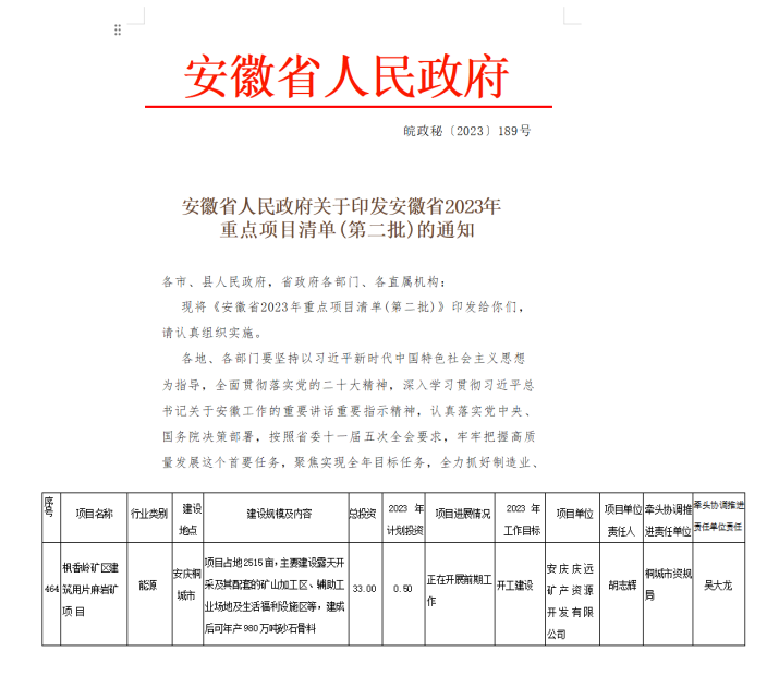 近日,安徽省人民政府发布了2023年重点项目清单(第二批),桐城枫香岭片麻岩矿项目从众多申报项目中脱颖而出,成为安庆市2个A类能源重点项目之一。