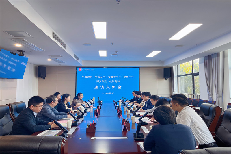 10月24日下午,中银理财权益与量化部总经理王起为率中银理财、中银证券、中国银行安徽省分行、中国银行安庆分行等金融机构来公司开展业务座谈,同安控股党委委员、副总经理盛丽君出席。